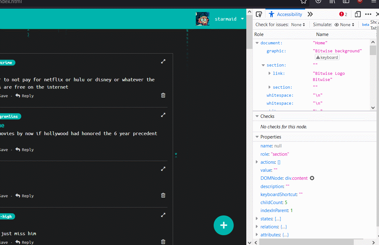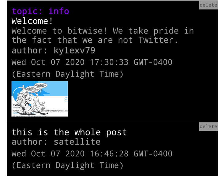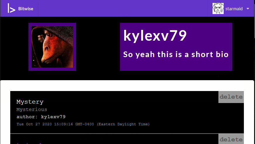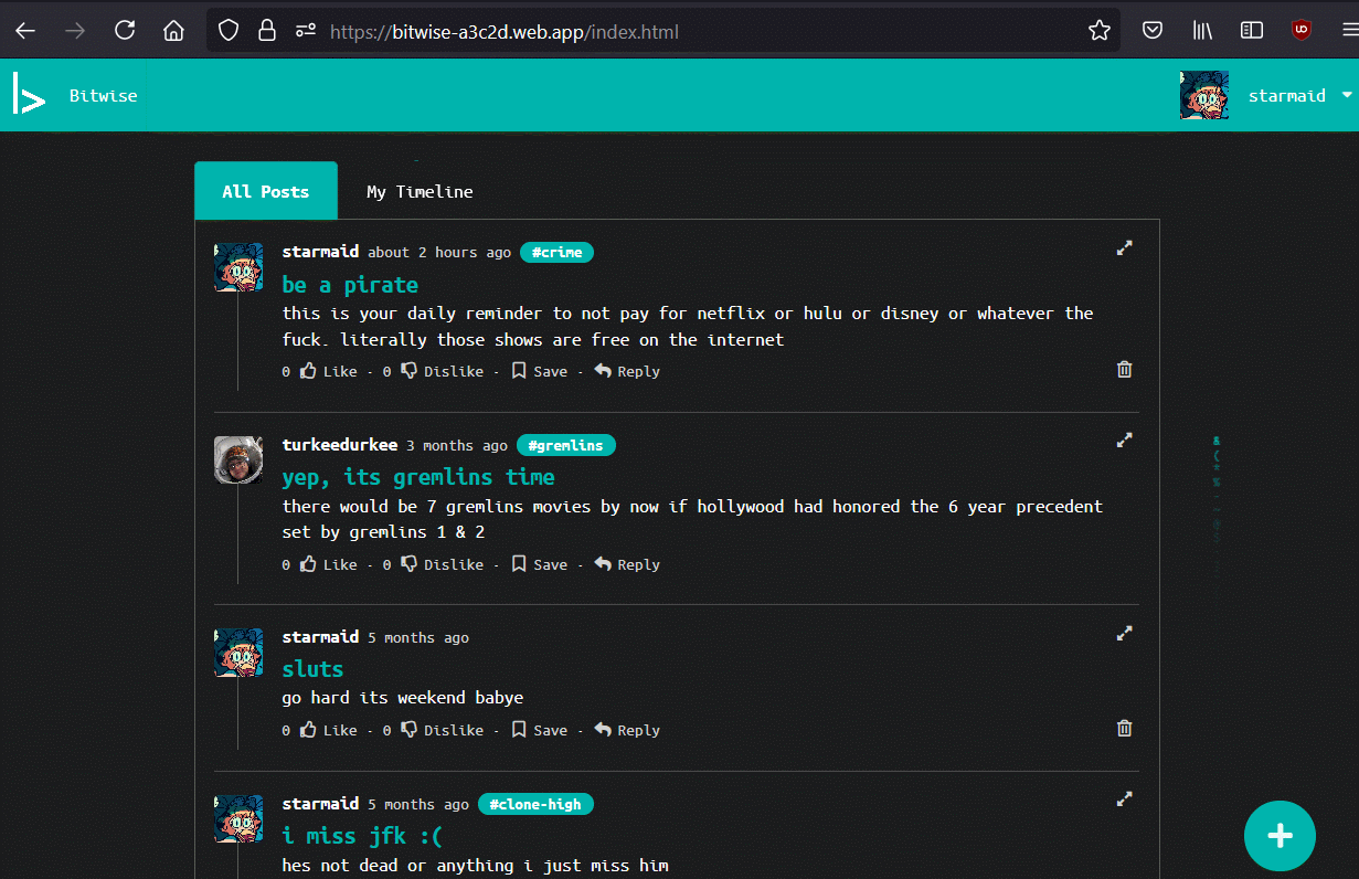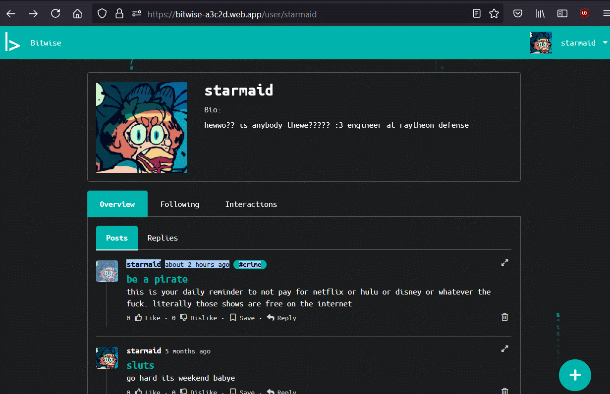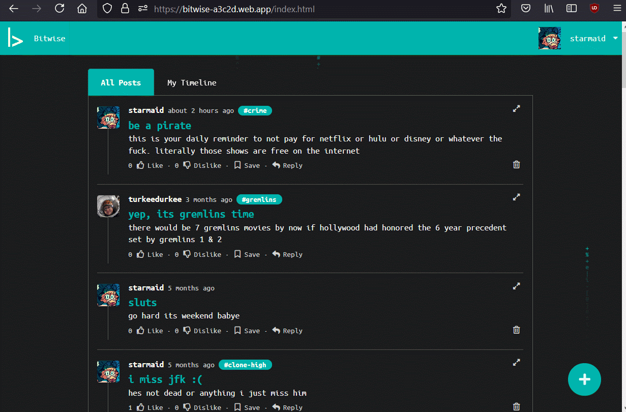 One of my main tasks was to get unique pages for users, topics, and posts. I wanted to use the CRUD method, with a bitwise.com/user?u=USERNAME kind of layout that would grab that POST data and give you back the necessary information from the server. However, I was having issues with how firebase Functions work, and they cant call the sendFile function, as the Firebase Functions run in their own sandbox away from the website data. I could have worked them harder to do both a redirect and then a function that would run on the same event, but we were on a tight schedule with many other tasks to cover.