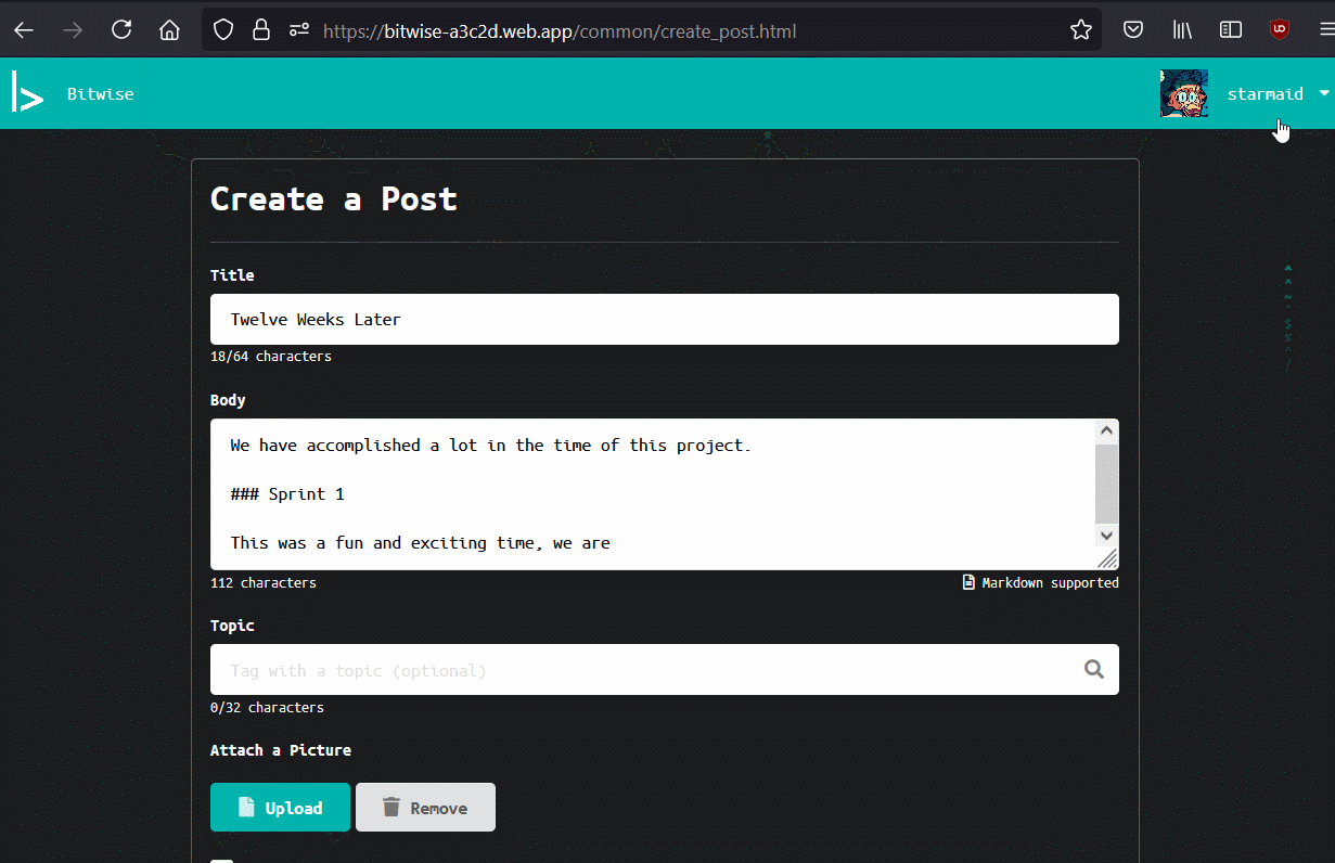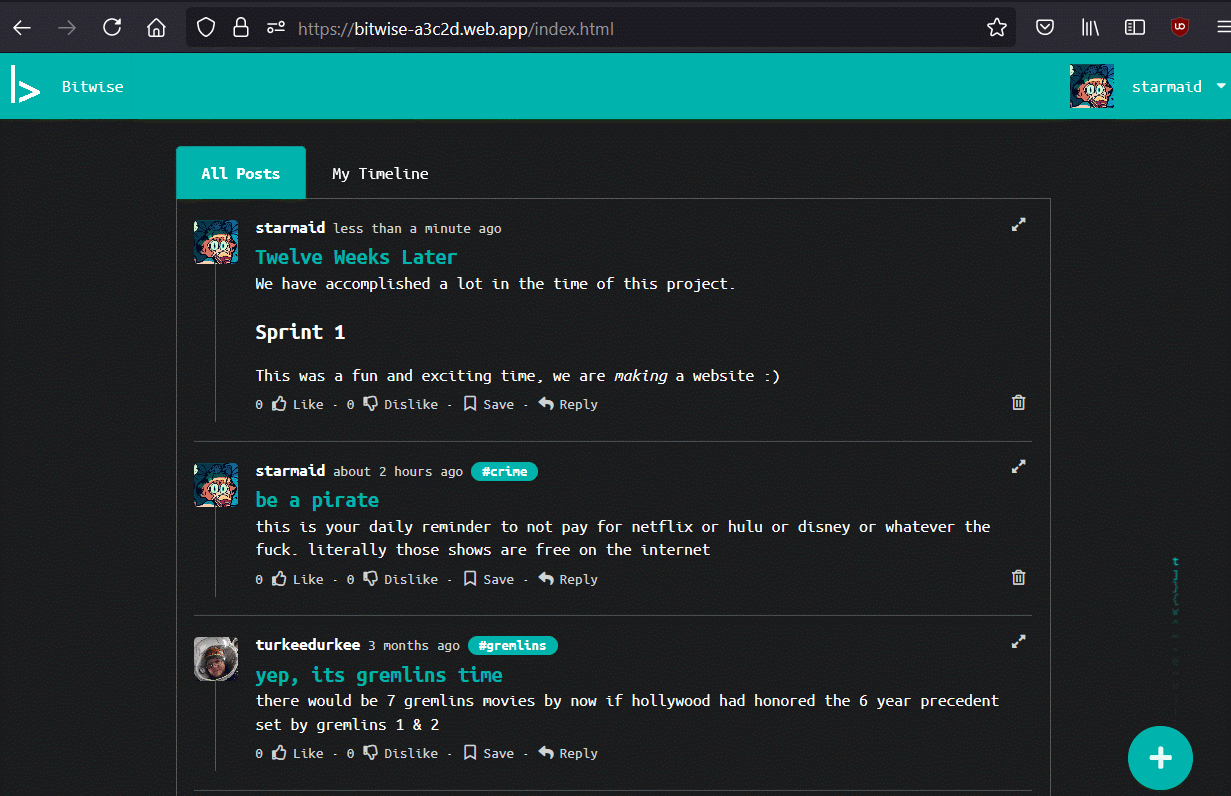 We made a website we were proud of. It works. You can sign up with Google. You can post with images. You can go to every expected pages, we have topics and tags and everything. We got full marks on the project, big shoutout to our TA for being receptive to our vision. It was a bit of a shame we did not get to explore some more out-there concepts for a social media site, but we learned the concepts we needed to for being fullstack developers on modern platforms. This is the expected outcome of the class.